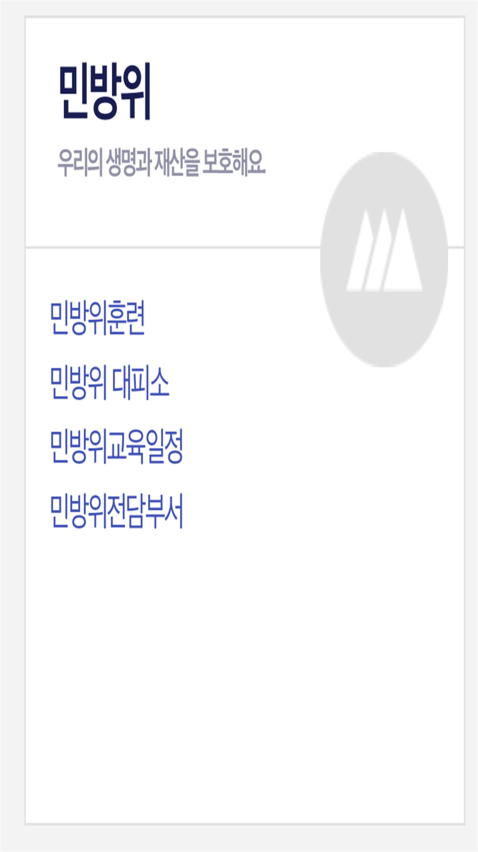 스마트폰으로 국민재난안전포털에 접속하면 ‘민방위’라고 적힌 메뉴가 보이는데요. 이 민방위 메뉴 아래에 ‘민방위 대피소’라고 적힌 항목이 있어요.