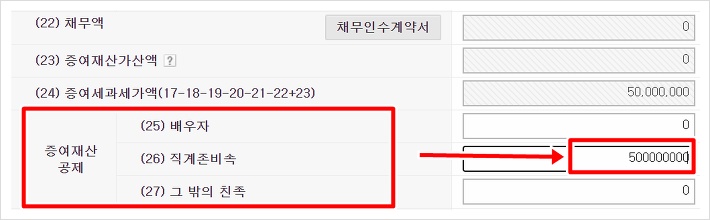 평가금액에 경우에는 자식인 경우에는 직계존비속인 경우에느 5천만원, 미성년자는 2천만원, 배우자는 6억, 기타친족은 1천만원이기 때문에 이 금액을 입력을 하시고 등록하기를 선택을 하시면 됩니다.