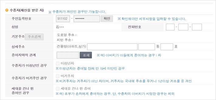 재산을 증여를 하는 사람이 개인인 경우에는 개인을 선택을 하시고 주민등록번호를 입력을 하시면 됩니다.