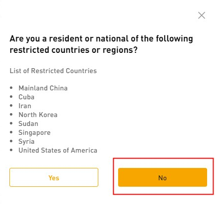 Create Account를 클릭하면 윗 사진과 같은 문구가 뜰수가 있는데요 회원가입 금지국에 우리나라는 포함이 되어있지않기에 NO를 클릭하시면 됩니다.