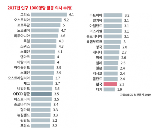 OECD 2019년 보건 통계자료에 따르면 한국은 인구 1000명당 희사수가 2.3명으로 OECD 평균 3.5명 대비 65.7%에 불과합니다. 지방은 수가 부족해 몇억의 연봉을 제시해도 구하기 어려우며, 급격한 고령화 추세로 의료진의 수요는 지금보다 더 커질것 입니다.